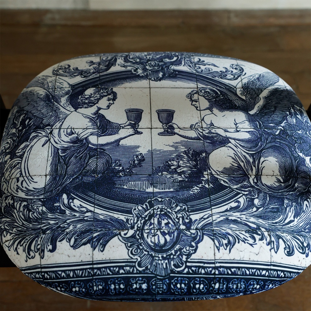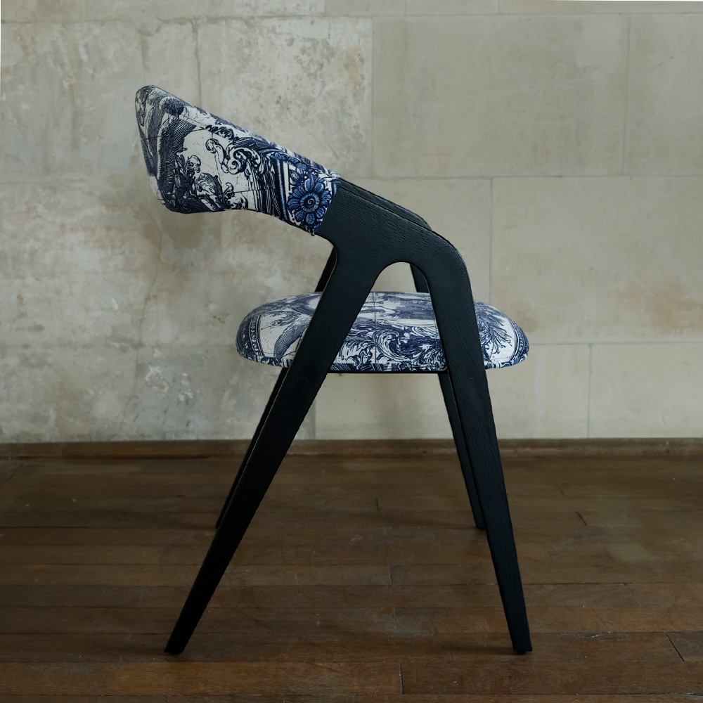 Structura din lemn masiv, cu finisaj negru mat, oferă o bază solidă și elegantă, iar tapițeria sa devine centrul de atracție. Motivele alb-albastre, cu reprezentări de îngeri (cherubini) aflați într-o scenă de comuniune, evocă ideea de armonie și transcendență – o legătură subtilă între lumea materială și cea spirituală. Textura bogată, detaliile fine și paleta cromatică atemporală transformă fiecare scaun într-o piesă de colecție.